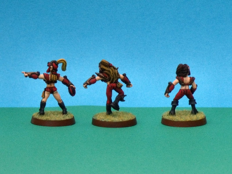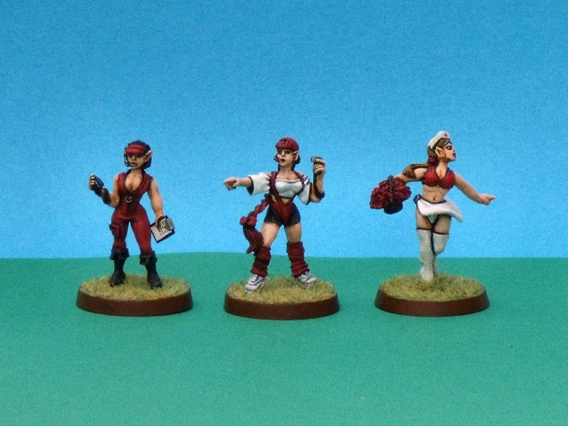 Next, four catchers. These are the only position players for which I have any duplicate models. There are only two different sculpts, but up to four Catchers can play on an Elf team. Although it’s hard to see in this picture, I’ve made the duplicates a bit more distinguishable by giving them differently coloured hair, which was about the only thing that it made sense to vary in their colour scheme. Shadowforge describe these players as ‘Receivers’: